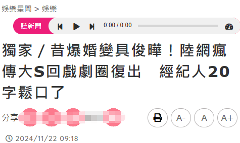 台媒报道指出,网友看了网飞的新作品《影后》,将片中的角色带入到大S身上,大S也曾感叹没有适合的角色可以出演,紧接着大陆社交网站就疯传大S复出。