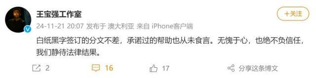 随后,王宝强工作室发布微博,“白纸黑字签订的分文不差,承诺过的帮助也从未食言。无愧于心,也绝不负信任,我们静待法律结果。”