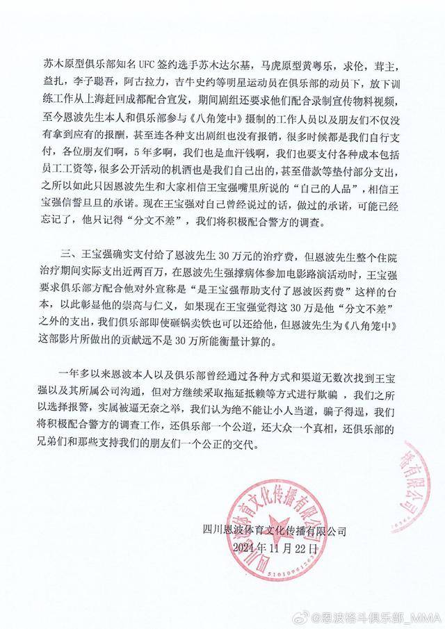 11月22日,针对王宝强工作室的回应,恩波格斗俱乐部发布声明。