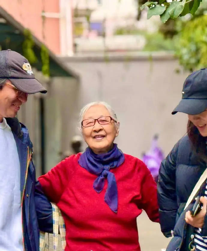 骆老师挽着汤唯及其老公的手,画面看起来很温馨。