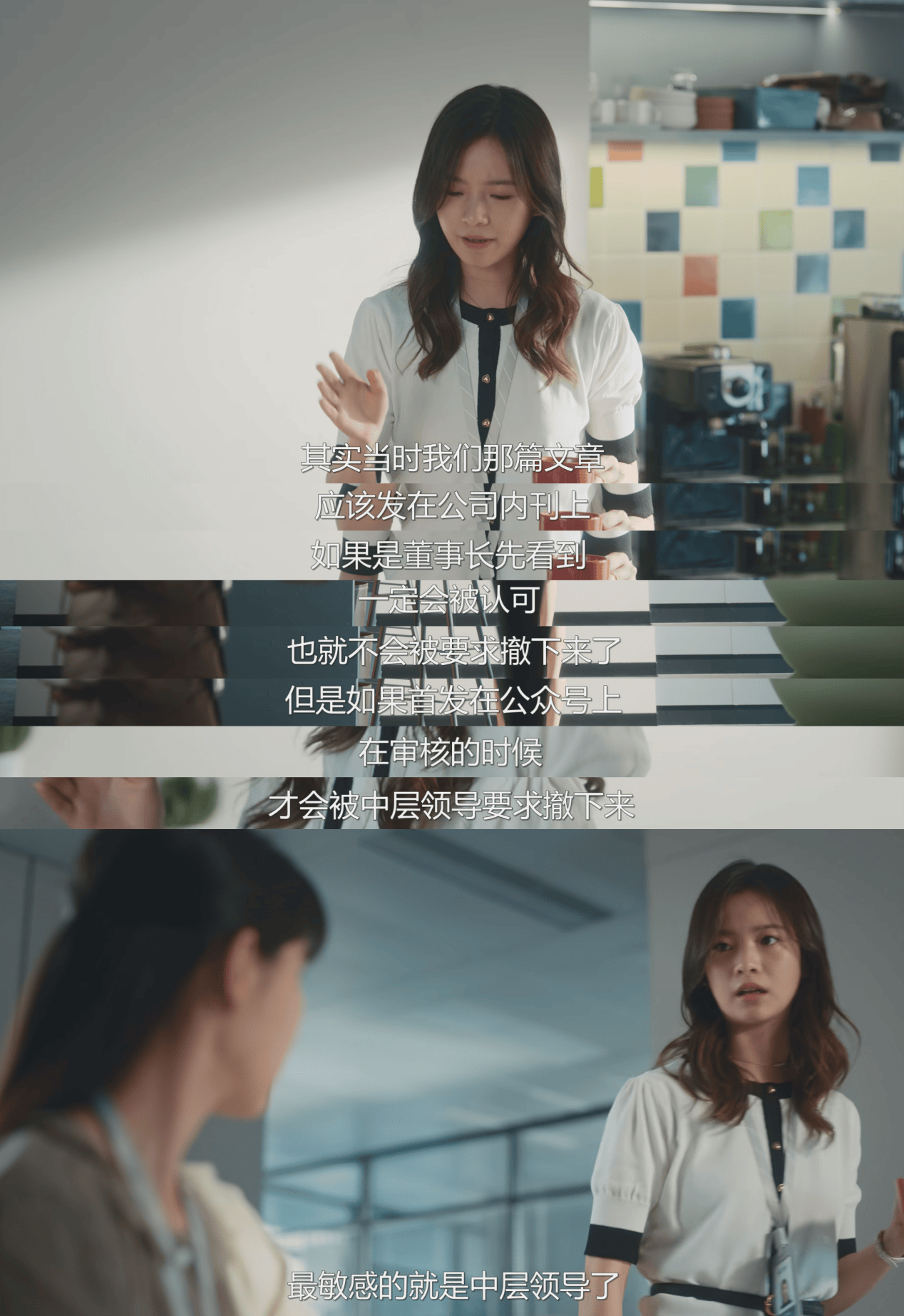 吴秀雅在说脱口秀之后,在职场上拥有不讨好的勇气,也在职场上逐渐扬眉吐气。可以理解编剧这样写的意图,但客观地讲,剧中依然沿用了董事长明察秋毫的写法,太爽剧了。真实的职场环境中,高层管理者往往难以全面了解某个基层员工的真实情况,而剧中董事长却总能精准洞察吴秀雅等员工的努力与困境。坏的都是中层,一把手都是好的,也反映出《不讨好的勇气》对职场机制本身的反思不够彻底。