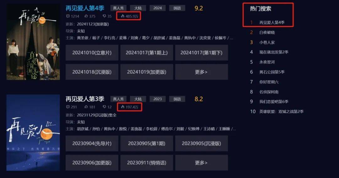 iyf上,再见爱人4的热度更是飙升到485.9万,和再见爱人3的197.4万的热度直接拉开断档优势,更是挂在了热门搜索榜的No.1!