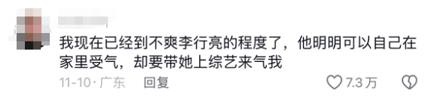 “已经不爽到李行亮身上了,他明明可以自己在家受气,但却非得把她带上综艺来气我。”