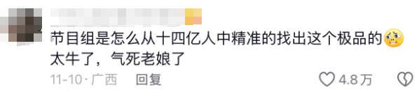 “节目组是怎么从十四亿人中精准寻找出这个极品的,太牛了。”