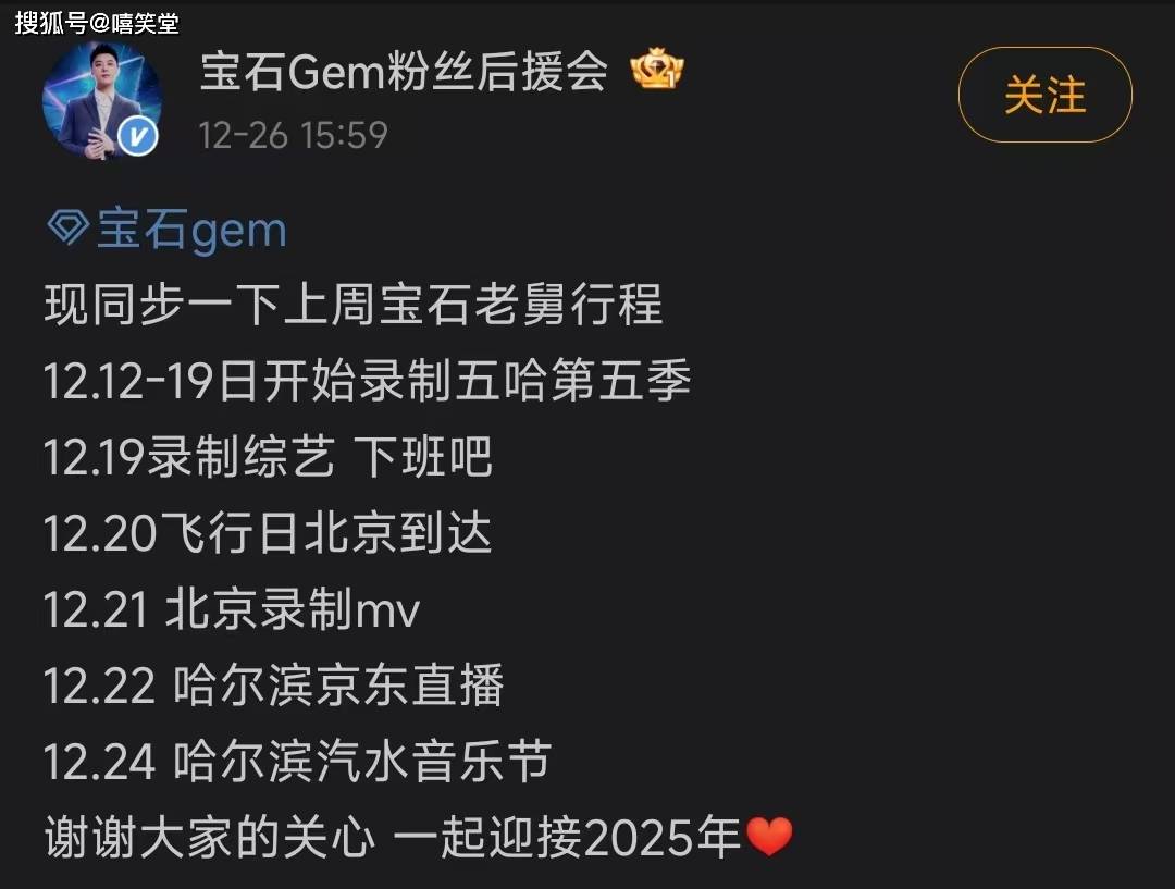 宝石老舅的粉丝后援会晒出老舅的12月行程。