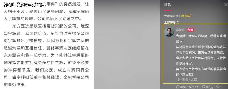 不仅如此,俞敏洪还把与辉同行所有的净利润都奖励给董宇辉。