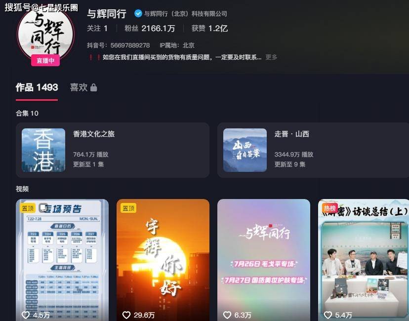 当天晚上7点钟左右,与辉同行的抖音号粉丝数2149.5万;到了晚上11:50分,与辉同行粉丝数量已经达到2166.6万。当晚涨粉超过10万。
