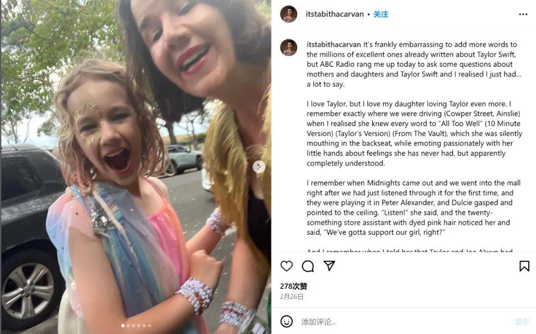 带女儿去时代巡演是我人生中最棒的经历之一,在现场可以看到所有年龄段的女性,有像她这么小的女孩,也有二三十岁或四十多的女性,还有妈妈们。大家尽情玩乐尖叫,穿自己想穿的衣服,这就是她需要的榜样。我的成长经历了巨大的变化和断裂,但是她不必再经历这些,她不必再说:我长大了,没法再去演唱会了。如果她在人生的每个阶段都想这样做,那这件事就不需要结束。