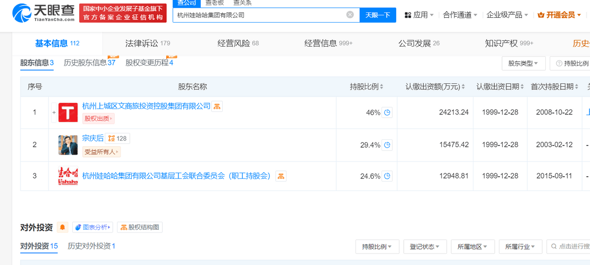 据天眼查APP显示,杭州娃哈哈集团公司的第一大股东是杭州上城区文商旅投资控股集团有限公司(国资)占46%,宗庆后占29.4%,剩下24.6%是员工持股委员会,员工这块没有公布具体的持股,应该人数比较多。
