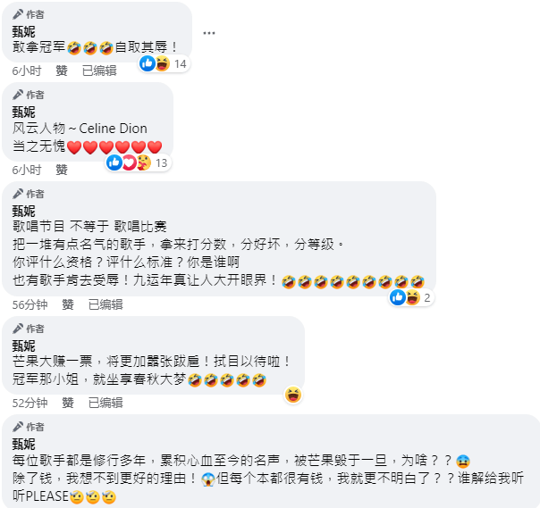 甄妮在评论区指名道姓,炮轰那英和芒果台,指那英拿冠军是“自取其辱”,吐槽节目组把“歌手们”玷污了。