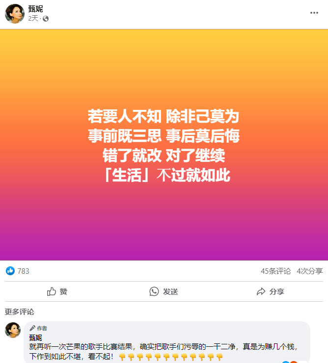 素来与那英有间隙的歌手甄妮发声炮轰,2天前发文:“若要人不知,除非己莫为...”