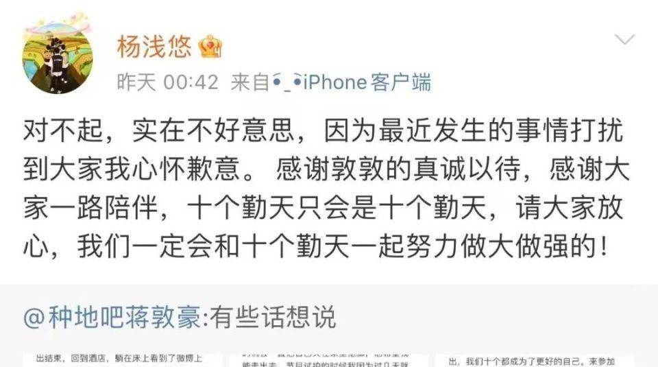 次日,官博发表声明,试图安抚粉丝。从结果来看,这个说法是失败的,官博粉丝流失越来越严重。声明对于粉丝最关心的“加新人”问题没有特别明确的回应,同时也对粉丝圈的行为进行了批评。三天时间,官博粉丝流失数百万,甚至有粉丝表示希望芒果TV挖走《十秦天》,开办新剧。22日,“十秦天”成员姜敦浩率先发长文回应,表示自己和导演组达成共识,新人是公司新员工,不是新成员。他还呼吁尽快解决误解,让该计划回归农业本身。随后,“十秦天”其他成员纷纷转发表示支持,导演杨千佑也转发长文为争议致歉。