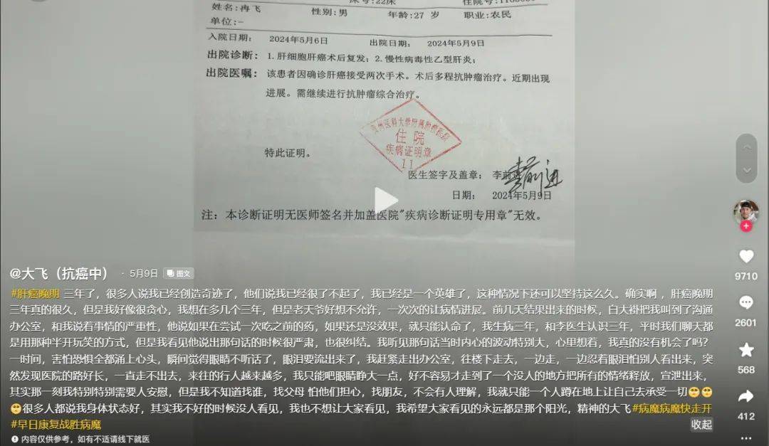 在今年5月,他发文:“ 3年了,很多人说我已经创造奇迹了,他们说我已经很了不起了,我已经是一个英雄了,这种情况下还可以坚持这么久。确实啊 ,肝癌晚期3年真的很久,但是我好像很贪心,我想再多几个3年,但是老天爷好像不允许,一次次让病情发展。”