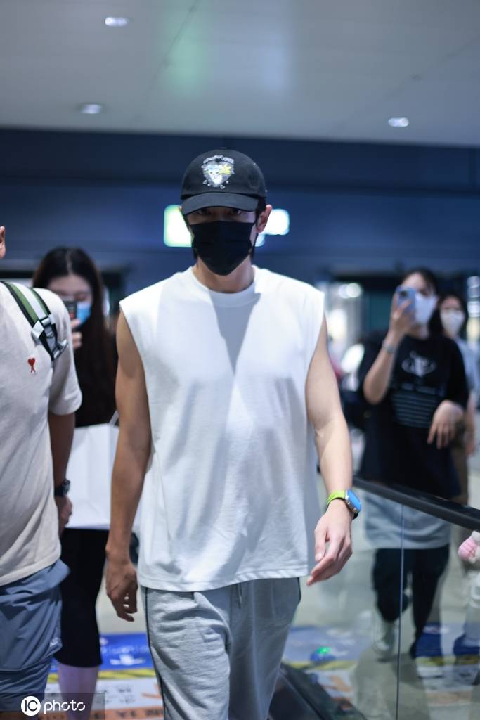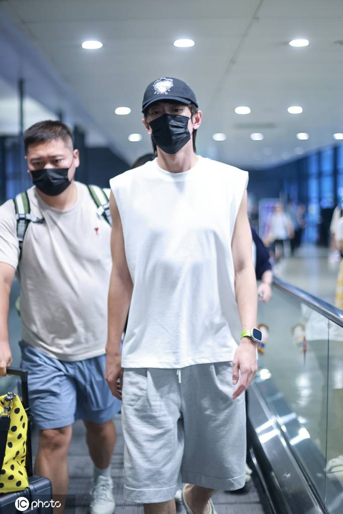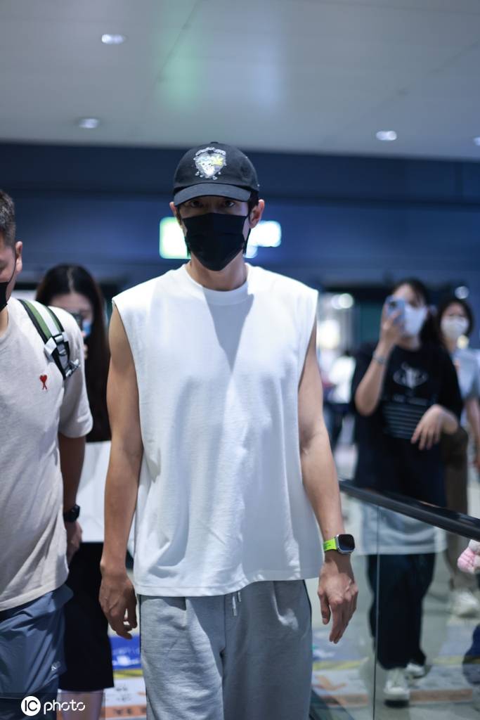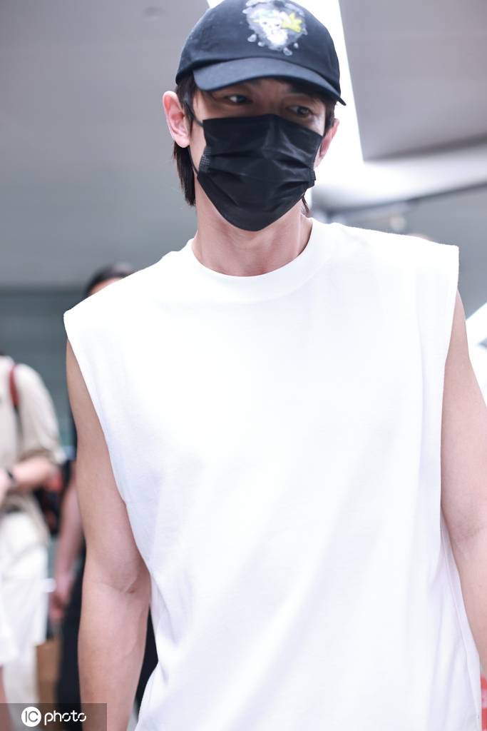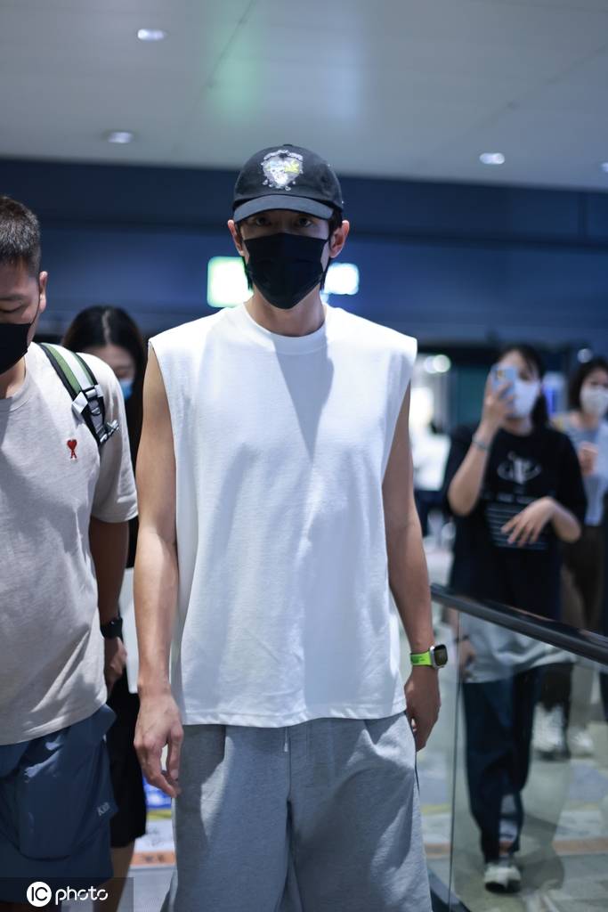 林更新现身上海机场,一身白色无袖背心搭配棒球帽,十分青春活泼。