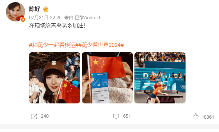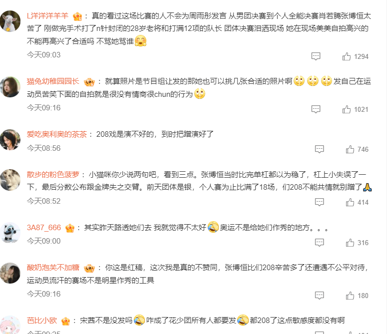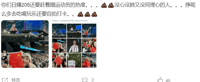 比如在围观男子体操全能比赛后,周雨彤发微,看起来很兴奋开心,虽然也是在为运动员加油助威各种鼓励,但显得太过开心,而场上的两位中国健儿,辛苦努力,却与金牌失之交臂,心情肯定会有些遗憾挫败低落,与周雨彤的开心形成鲜明对比。这样一来,本来看比赛录制节目就被吐槽,再这样不顾运动员心情自己忙着宣传营销,肯定要被吐槽。于是网友纷纷质疑周雨彤,最近她也只能删除微博。估计通过这些反馈,后面花少团看比赛,就不会买那么多热搜提前炒热度刷存在了。