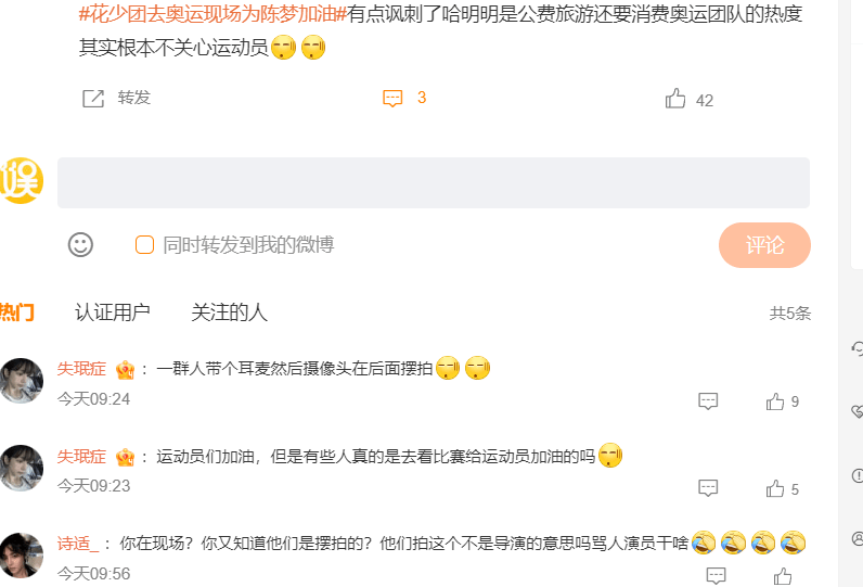 但是相比之下,陈好、宋茜、刘烨、金晨、周雨彤、邓恩熙、侯明昊、田嘉瑞、荣梓杉组成的花少团,影响就没那么好了。虽然大家都支持明星去赛场为健儿加油,享受旅游,但是他们却是公费旅游,打着支持奥运健儿的旗帜录节目蹭热度,被网友质疑吐槽,觉得围观比赛为健儿加油不太认真,还带着麦和摄制组,感觉是在蹭奥运热度,公费旅游赚钱,还有抢风头的嫌疑,之前就有过类似的吐槽。