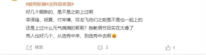 最后,从确保嘉宾、节目的质量到最新一季秀人、糊咖扎堆,《披荆斩棘》第四季嘉宾已经远不如前几季,你们还期待吗?
