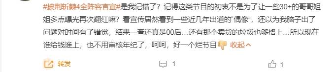 而在《浪姐5》收官,与其换汤不换药的男版大龄选秀节目《披荆斩棘》第四季强势回归,本以为这档备受平台偏爱的综艺会继续走花路,谁知全阵容一官宣非但没有收获好评,反倒遭到了群嘲。甚至有网友喊话看这阵容就知道内娱完了,请不到人可以不办。