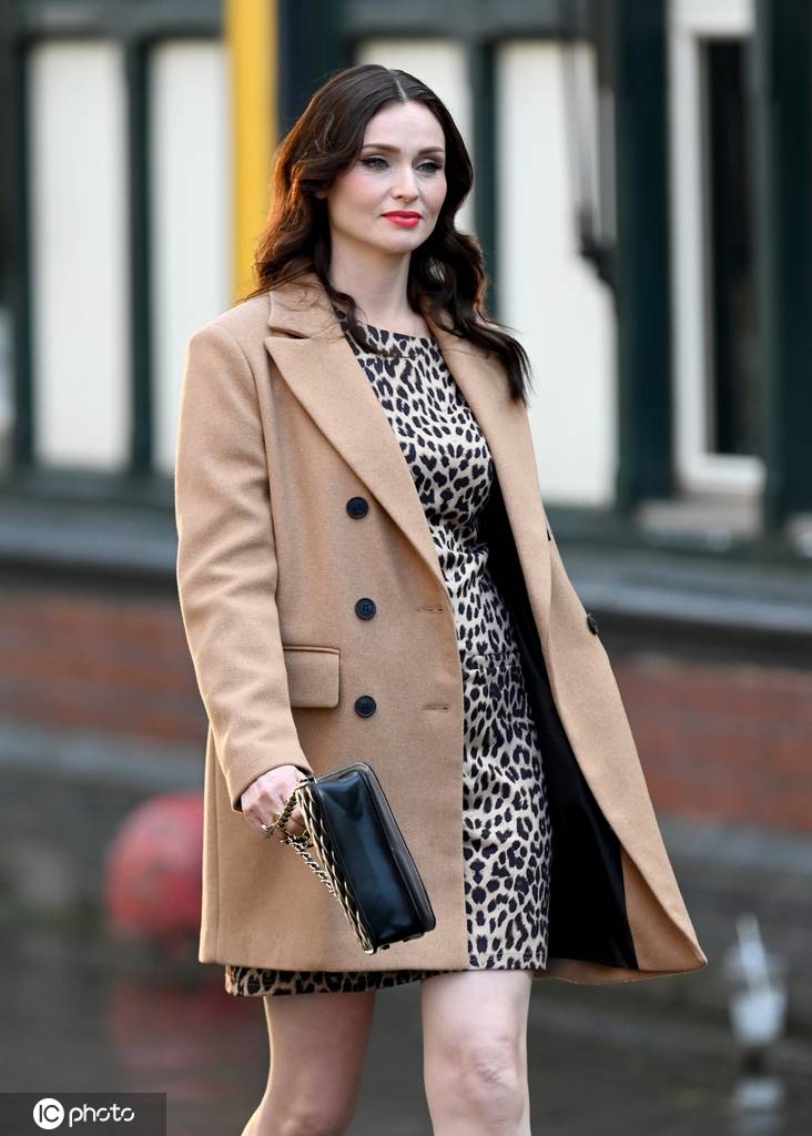 苏菲·艾利斯·贝斯特现身街头拍摄广告,身穿卡其色风衣豹纹短裙从容优雅。