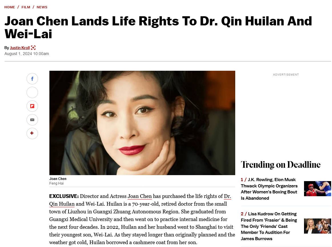 搜狐娱乐讯 近日,据外媒,陈冲拿下“70岁退休医生/时尚博主”覃惠兰阿姨和其子黄未来的事迹的影视改编权。