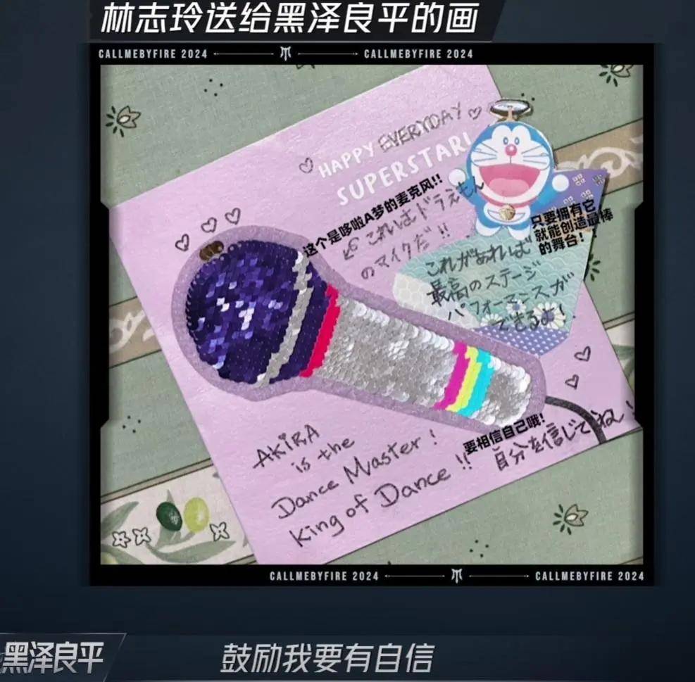 在备采内容中,节目组给了黑泽良平大秀恩爱的机会,展示了林志玲送她的参赛鼓励,她亲自画了一幅麦克风的画,说是哆啦A梦的麦克风,鼓励她要有自信。