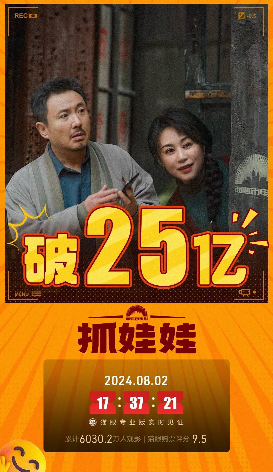 搜狐娱乐讯 据猫眼专业版数据,截至8月2日17:37,闫非、彭大魔执导,沈腾、演员马丽领衔主演的暑期档喜剧电影《抓娃娃》上映第18天,累计总票房破25亿,累计观影人次6030.2万,暂居身2024年内地电影票房榜第三。