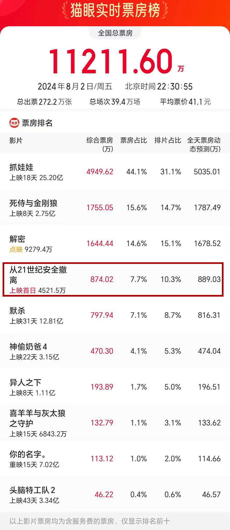 上映首日,《从21世纪安全撤离》票房不足千万,加上点映票房,还未能突破5000万。