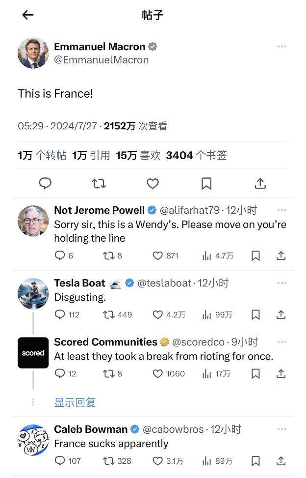 有人在转发2008北京奥运会开幕式,有人在法国总统马克龙社交账号下表达不满……