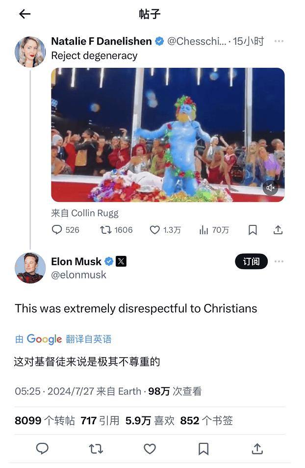 马斯克对巴黎奥运会开幕式的评价,图源:X