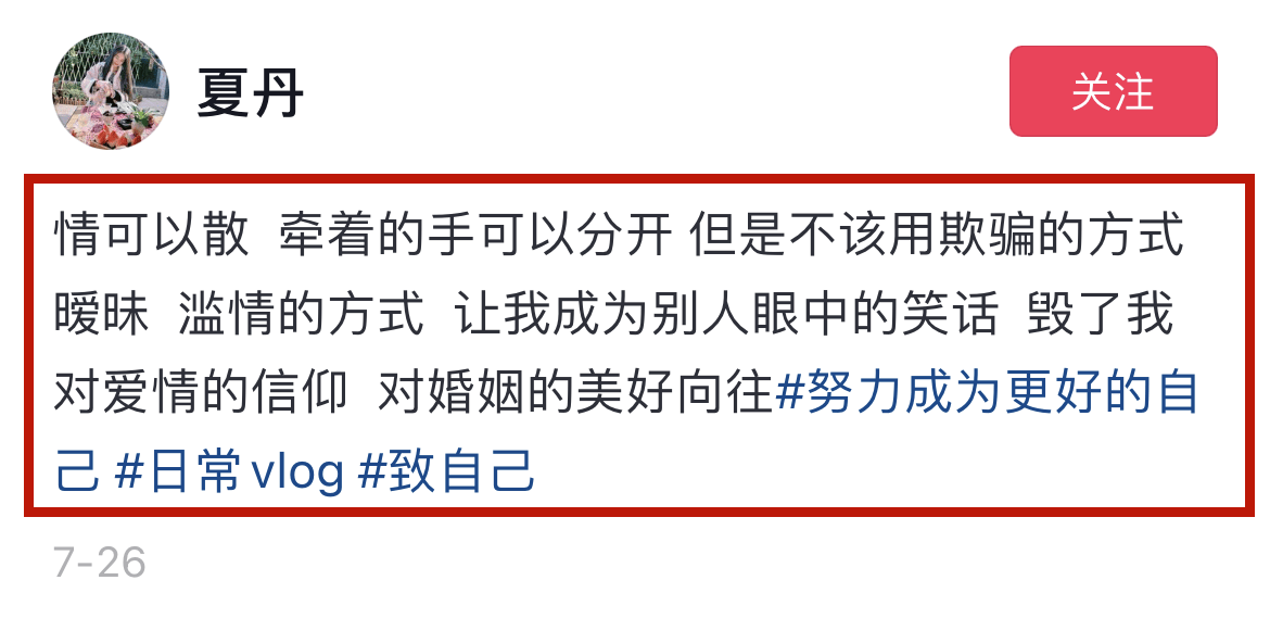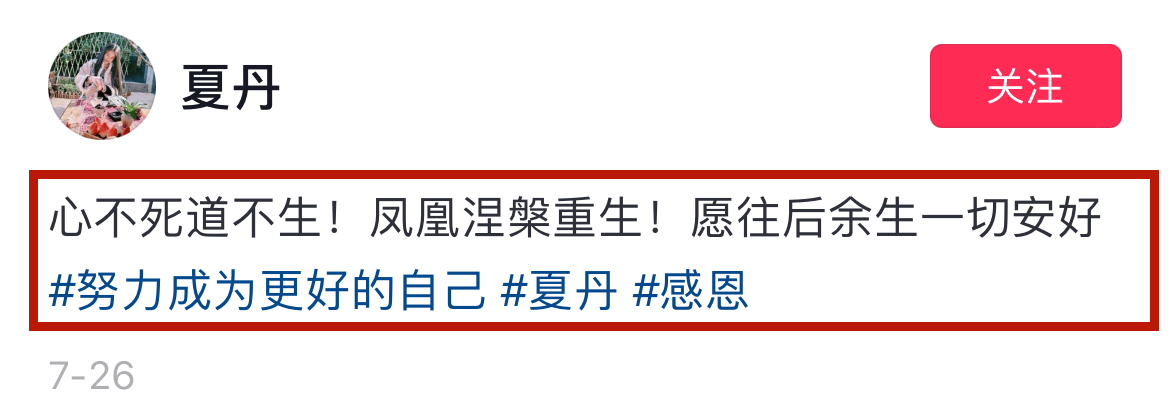 近段时间的夏丹也好似“脱离了苦海”,从上个月中旬开始,她便不断分享日常动态,言语中透着豁达与释然,而且还多次分享自己对恋情的感悟。