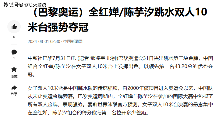 中国新闻网 2024-08-01 《(巴黎奥运)全红婵/陈芋汐跳水双人10米台强势夺冠》