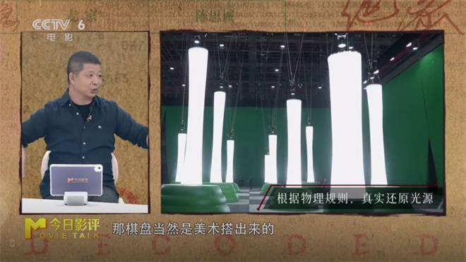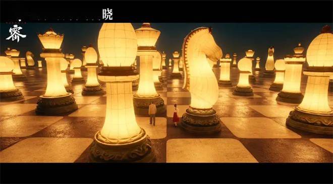 比如影片中有一个镜头是两个人跑出一个巨大的棋盘,棋盘是美术搭出来的,还做了几十个五米高的筒子,里面装满了灯,再把它放在数字调光台上编程,让它们可以闪烁,最后再依靠CG把这筒子修成了国际象棋的形状,才呈现出这场游乐场的梦境。