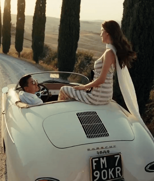 施伯雄和吴千语在意大利的古堡现场,开着古董车浪漫感十足,夫妻在行驶的汽车上面玩浪漫,这氛围感很强,令人十分羡慕。很美,很靓很帅的一对,祝福。有一种电影男女的既视感,好浪漫的存在,羡慕。
