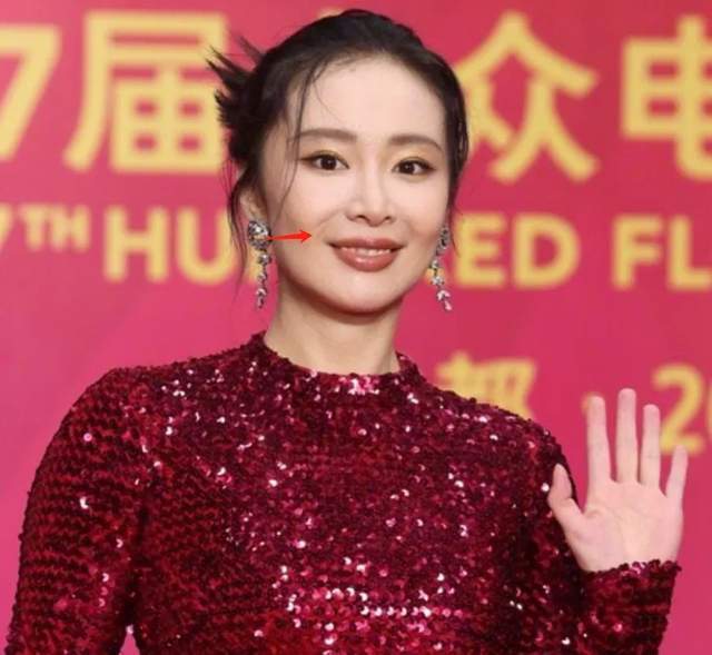 44岁的殷桃整体的状态还是不错的,面部紧致,两个梨涡非常明显。笑起来的时候侧脸筋肉有些僵硬,硬是笑出了方脸的感觉。