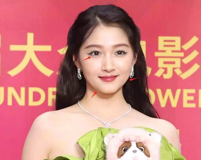 妆容上还设计了绿色的眼影,从媒体放出的生图来看,关晓彤的皮肤状态是不错的,看来平时没少保养。但脸型依旧肉嘟嘟的,笑起来的时候,脸颊的肉都往两边挤,还隐约能看到双下巴。
