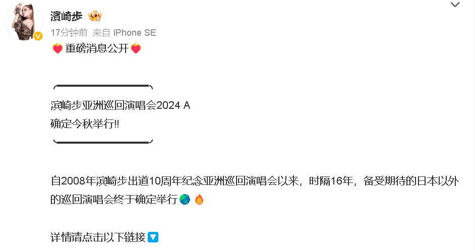搜狐娱乐讯 8月5日,日本国民级女歌手滨崎步发问,宣布将于今年秋天开启新一轮亚洲巡演。这是自2008年滨崎步出道10周年的纪念亚巡之后,时隔16年再度开启的亚洲巡回演唱会。