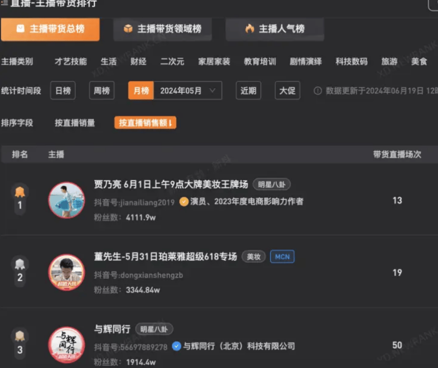 其实,早在5月,贾乃亮就以7.07亿的销售额拿下带货主播榜一,而多次霸榜的董宇辉也不过做到5亿多的成绩。