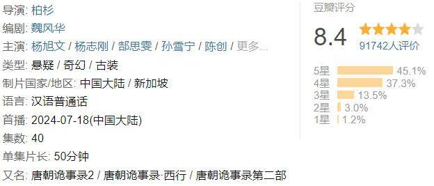和《天行健》一样,《唐朝诡事录之西行》刚开播之时也被严重低估,出现不少差评,但豆瓣开分就拿下8.1分,而随着一集又一集相继播出,豆瓣评分不降反升,最新评分已飙上8.4分。