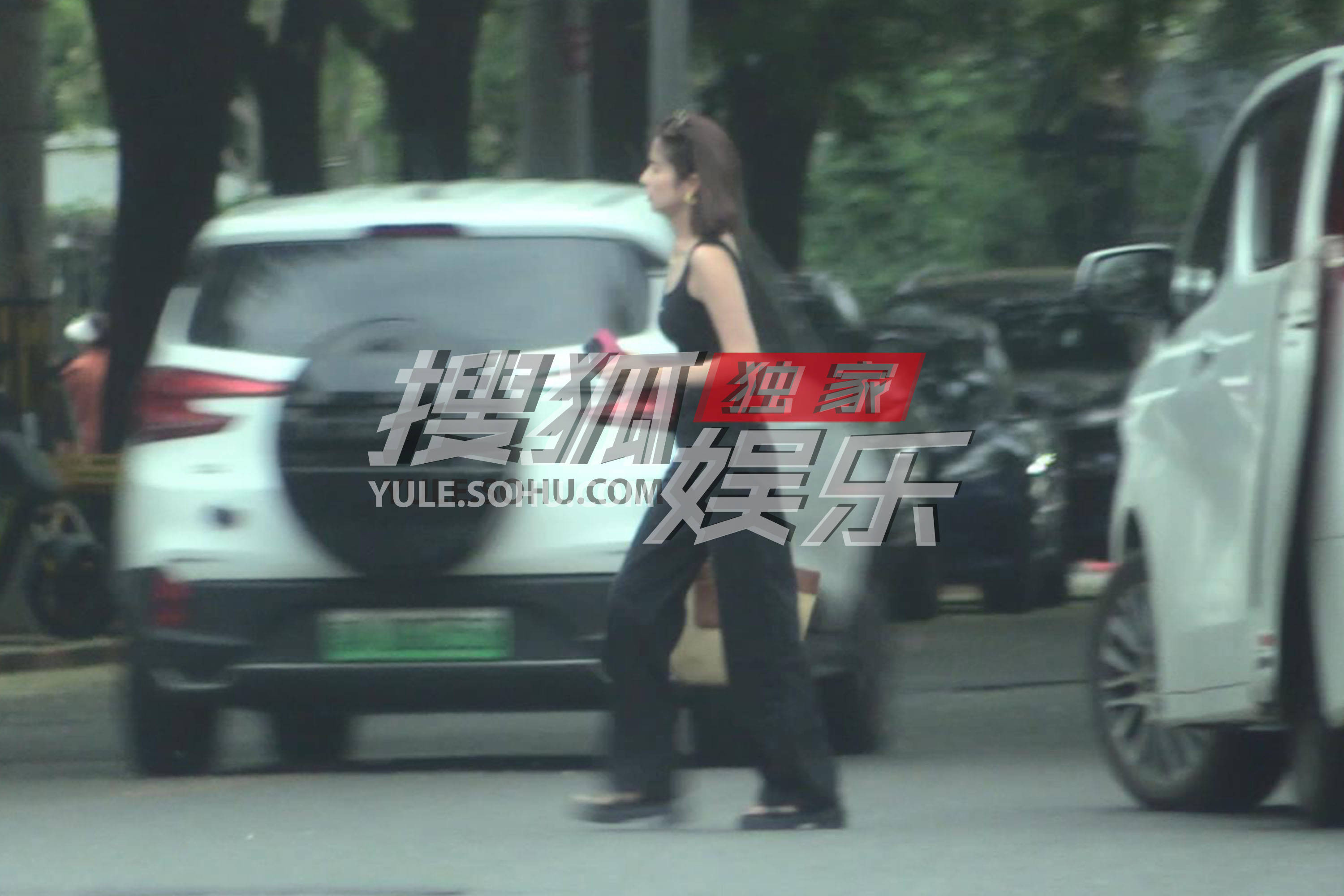 颖儿穿着黑色背心搭配运动裤,提着草编包包,挺有活力的少女感觉。