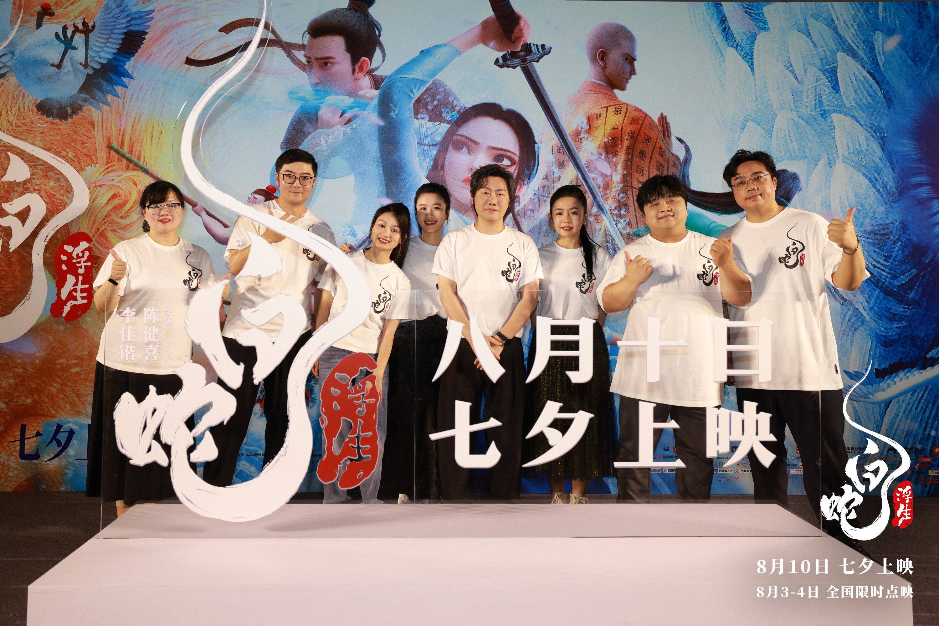 新京报讯(记者周慧晓婉)8月2日,电影《白蛇:浮生》举行“你我共此时”北京首映礼,导演陈健喜、李佳锴,制片人曾凡预,音乐总监郭好为,配音演员张喆、唐小喜、张赫、郑小璞等主创集体现身,现场嗨玩配音秀、与观众真情交流,映后全场高唱《千年等一回》,气氛节节高涨。不少观众更是给出五星好评,影片兼具浪漫情感与喜剧元素,受到全年龄层观众的喜爱。影片将于8月3-4日开启全国限时点映,8月10日七夕正式上映。