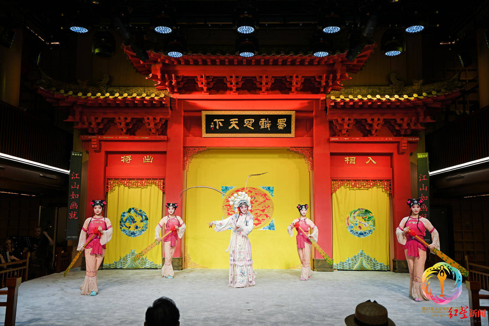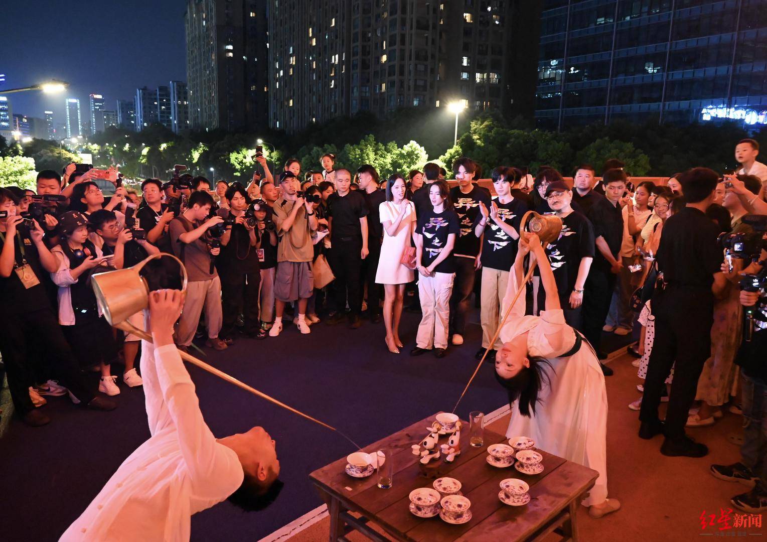 夜幕降临,天府双塔与交子之环遥相辉映。交子之环上,随着音乐奏响,川剧演员闪亮登场;一提、一倒,茶香浓郁,长嘴壶茶艺人展现了川派长嘴壶茶艺的精湛技艺。