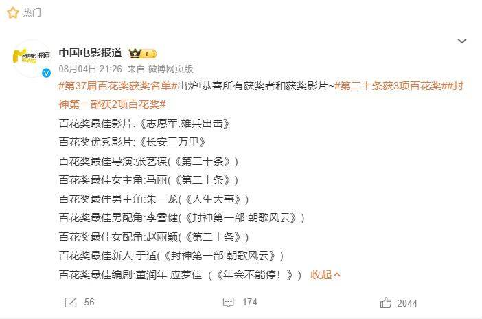 第37届大众电影百花奖颁奖典礼8月4日在成都举办。