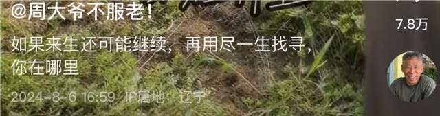 网红“周大爷不服老”在其视频账号上分享了一段画面,并在留言处感慨的说道:如果来生还可以继续,再用尽一生找寻,你在哪里。