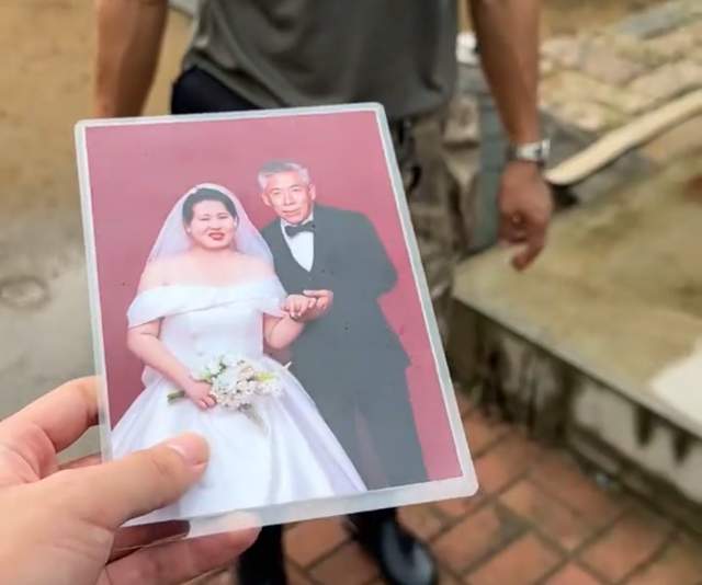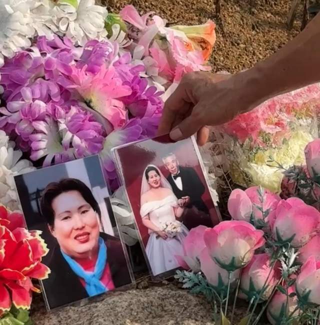 曝光的画面中,周大娘的坟墓前摆满了鲜花,在花丛中有着两张非常醒目的照片,第一张是周大娘的个人照,第二张则是两人的结婚照,不过结婚照看起来有些突兀,而且有些“格格不入”,细心的网友发现,原来这张照片是通过AI合成的。