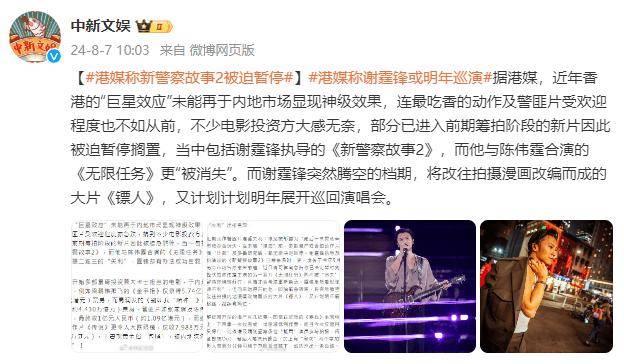 据港媒,近年香港的“巨星效应”未能再于内地市场显现神级效果,连最吃香的动作及警匪片受欢迎程度也不如从前,不少电影投资方大感无奈,部分已进入前期筹拍阶段的新片因此被迫暂停搁置,当中包括谢霆锋执导的《新警察故事2》,而他与陈伟霆合演的《无限任务》更“被消失”。而谢霆锋突然腾空的档期,将改往拍摄漫画改编而成的大片《镖人》,又计划明年展开巡回演唱会。