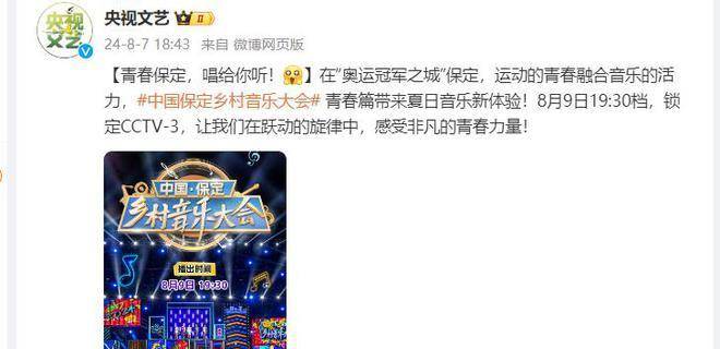 2024年8月7日下午18:43,央视文艺发布消息:【青春保定,为你歌唱! 【展望】】在“奥运冠军之城”保定,体育的青春与音乐的活力融为一体。 #中国保定乡村音乐大会#青春篇带来夏日音乐新体验! 8月9日19:30,锁定CCTV-3,让我们在跳动的旋律中感受青春的非凡力量!