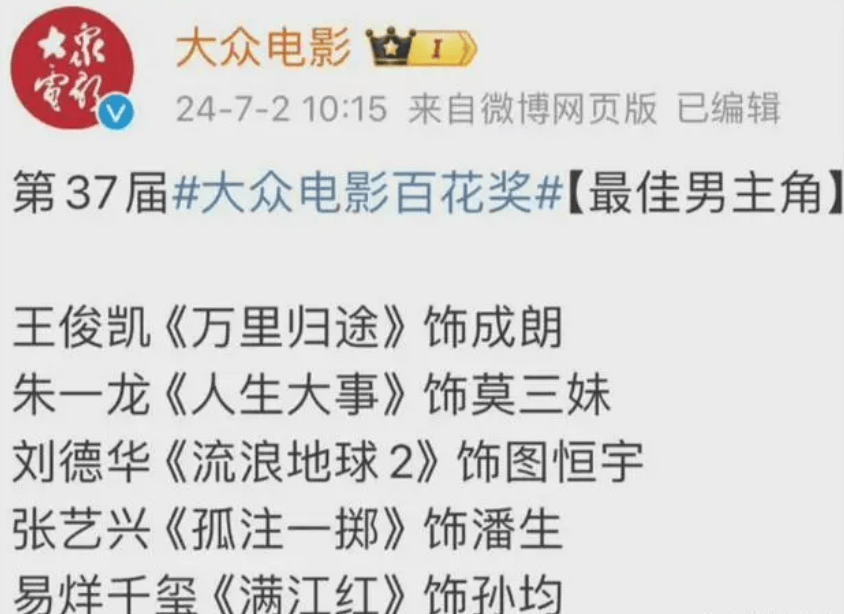 其中刘德华作为老戏骨票数不敌朱一龙,易烊千玺更是只拿到2票,光荣垫底...