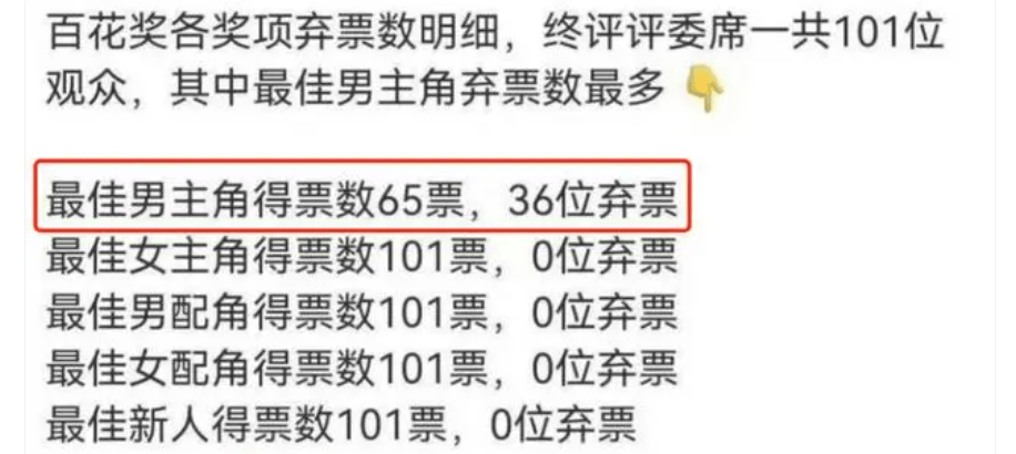 在最佳男主角的投票环节,一共101位终审评审,最终票数却只收到了65票,有36位大众评审弃票。