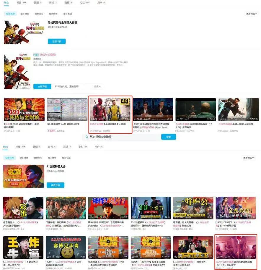 在搜索漫威新片《死侍与金刚狼》(下称《死侍3》)关键词时,B站搜索页面首页上同时出现了官方合作活动入口横幅、深度向PUGC二创以及盗版影片资源。无独有偶,近期被网友争相夸赞的国产口碑黑马电影《从21世纪安全撤离》(下称《21世纪》),也在B站上演了营销内容与盗版资源同框的现象。