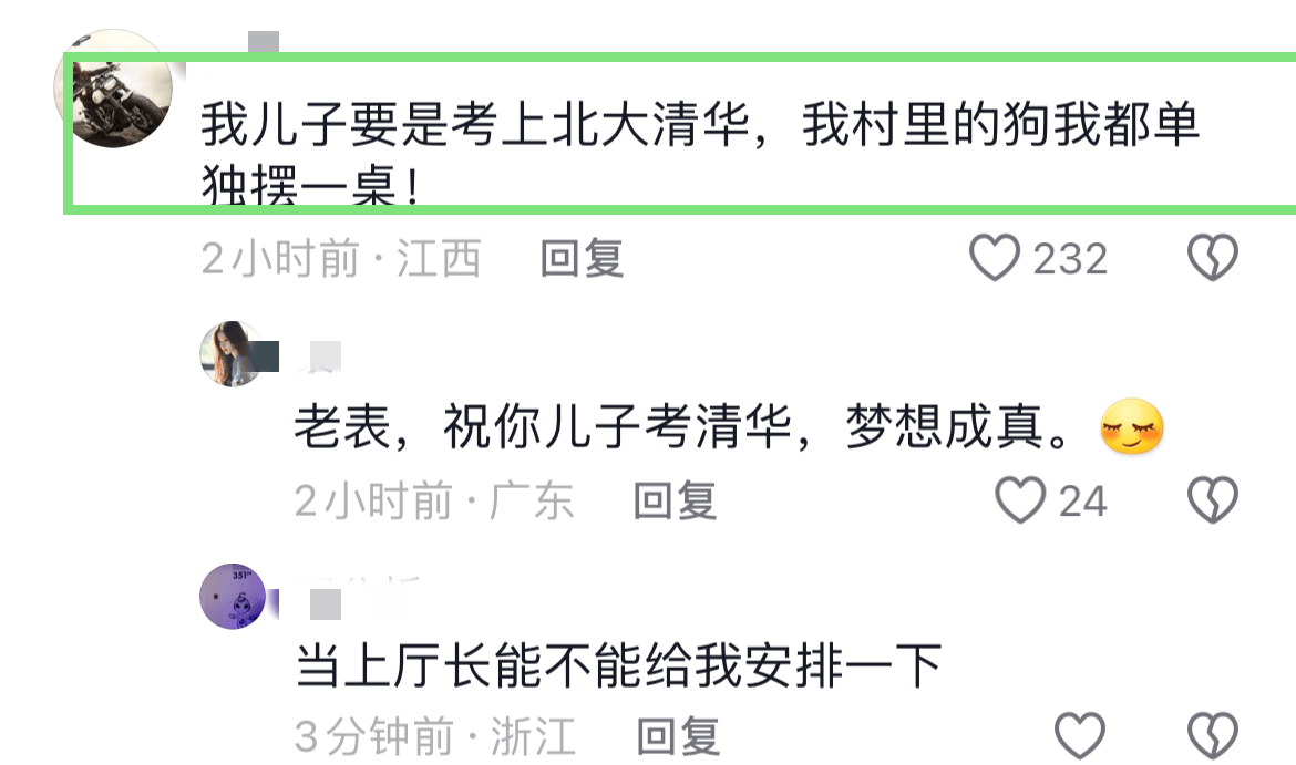 我儿子要是考上北大清华,我村里的狗我都单独摆一桌。